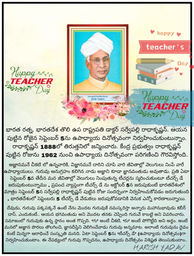 HAPPY TEACHER’S DAY Posted byYadanalaharishSeptember 5, 2022Posted inUncategorized Share this: Click to share on X (Opens in new window) X Click to share on Facebook (Opens in new window) Facebook Like Loading... Related